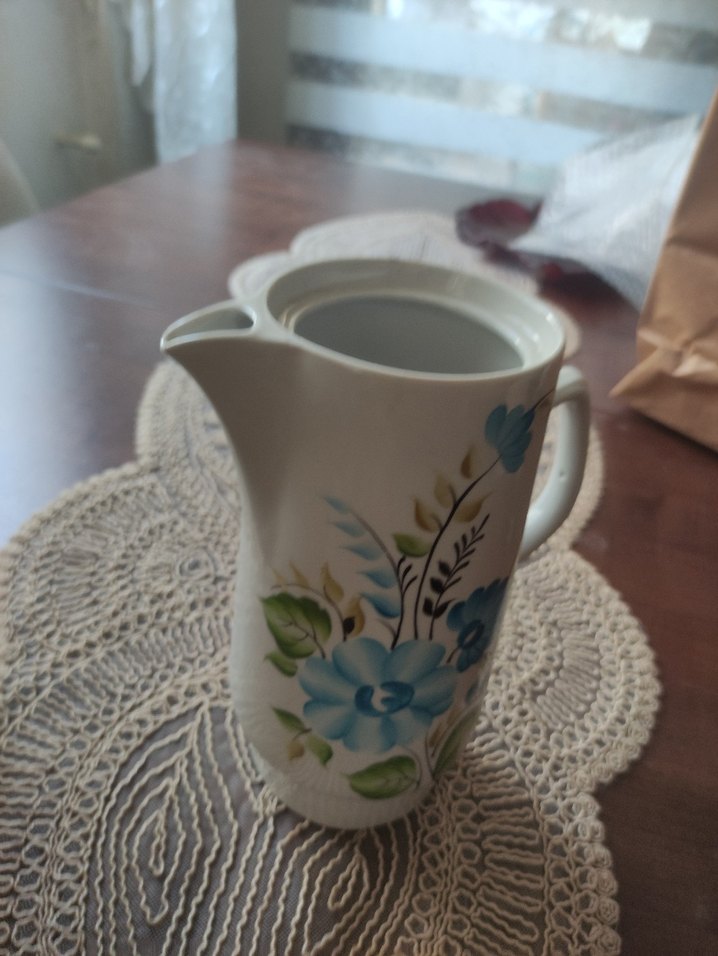 Pastel mavi çiçek desenleri ve rahat tutma sapı olan beyaz sürahi