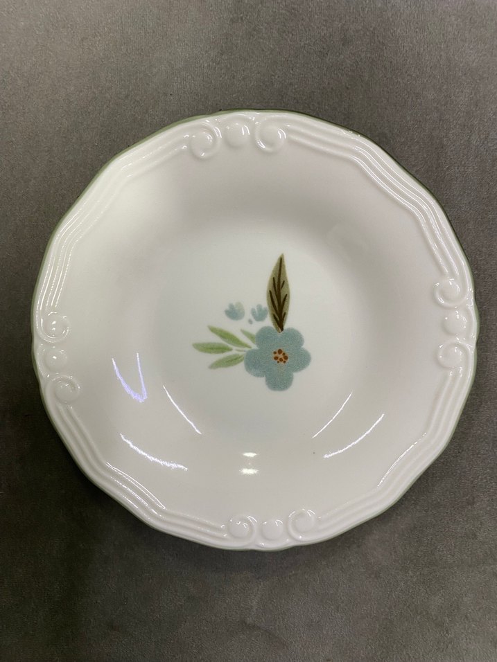 Dekoratif kenar detayları ve pastel mavi çiçek desenine sahip beyaz tabak. Yemek sunumları için uygundur. ️