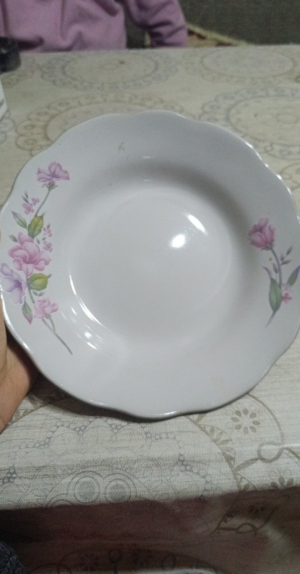 Bu beyaz tabak, kenarlarında pastel tonlarda pembe çiçek desenine sahiptir. Hafif dalgalı kenarları klasik bir görünüm sağlar. ️