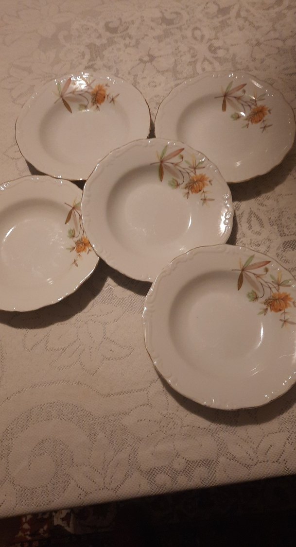 Pastel çiçek desenli beyaz seramik yemek tabakları seti. Her tabakta zarif çiçek deseni ve hafif dalgalı kenar bulunur. ️istanbul porselen 5 adet yemek tabağı 35 yıllık