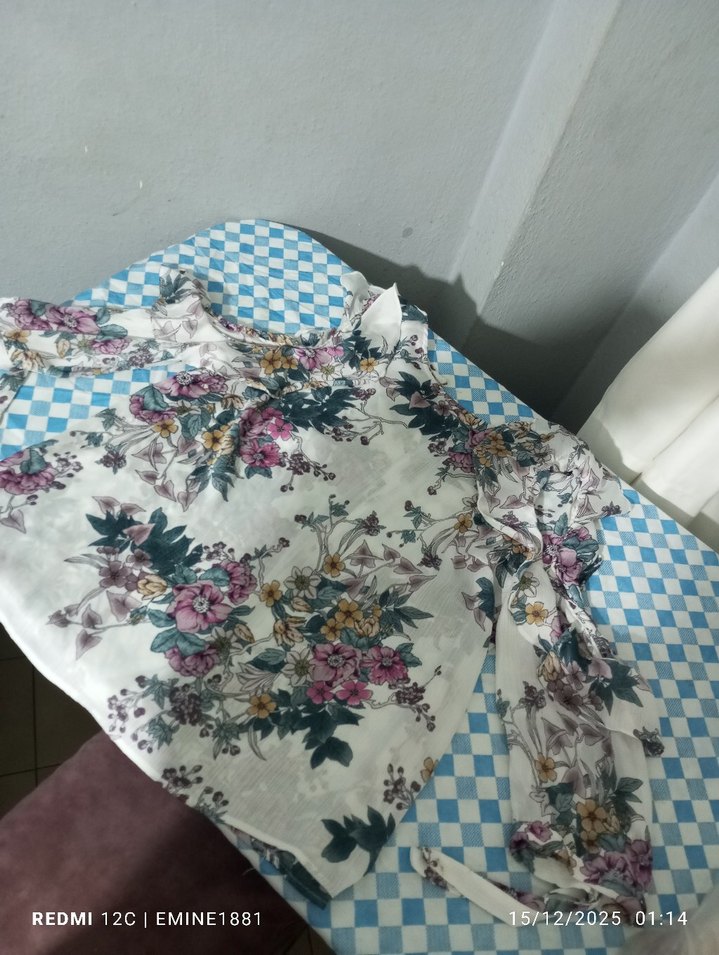 Beyaz zemin üzerine pastel çiçek desenli, uzun kollu, balıkçı yaka ve fırfır detaylı bol kesim kadın bluz. Vintage bohem tarzını yansıtır.