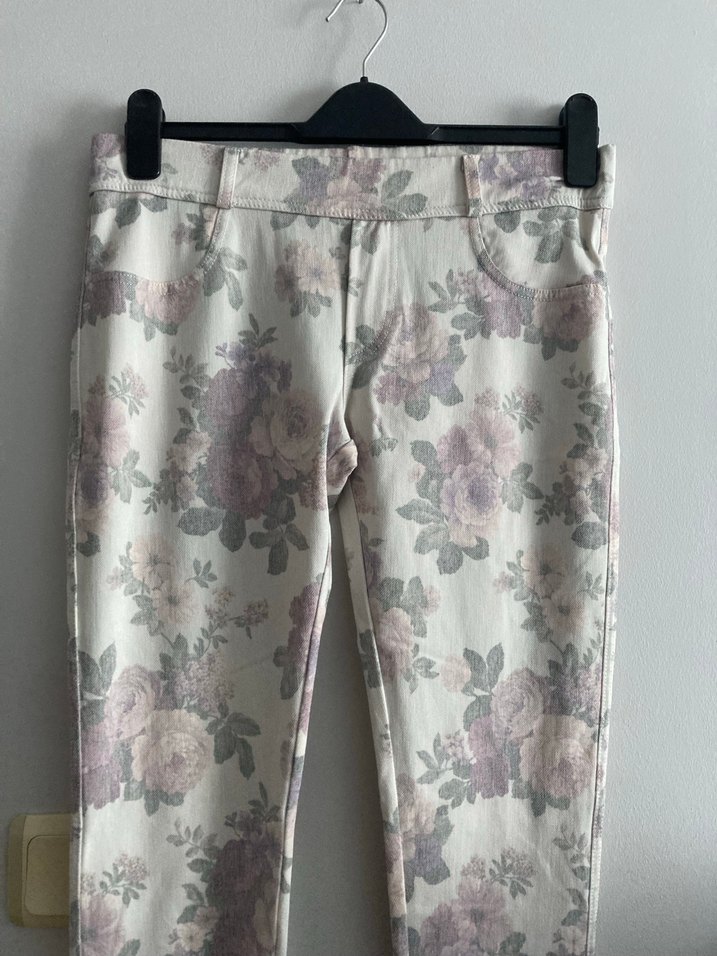 Beyaz zemin üzerine pastel çiçek desenli, düğmeli ve normal boyda, trend sokak tarzı kadın tayt pantolon.hiç kullanılmadı