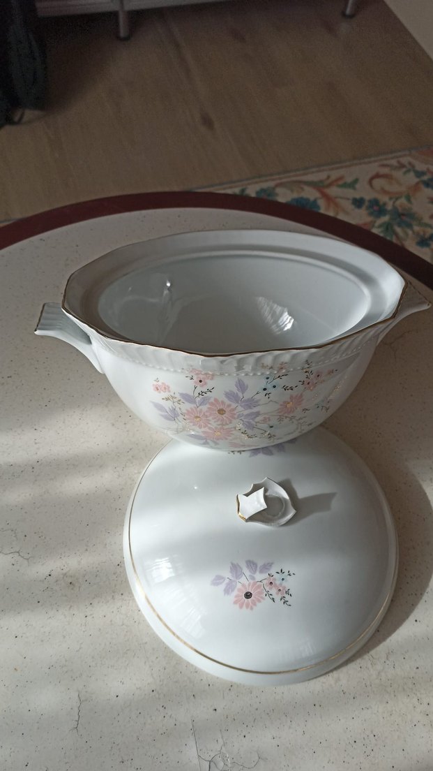 Beyaz porselen çorbalık, pastel renkli çiçek desenleriyle ve yanlarında tutma saplarıyla birlikte kapaklıdır. tutma kapak kısmı taşınma sırasında kırıldı ürün sıfırdır
