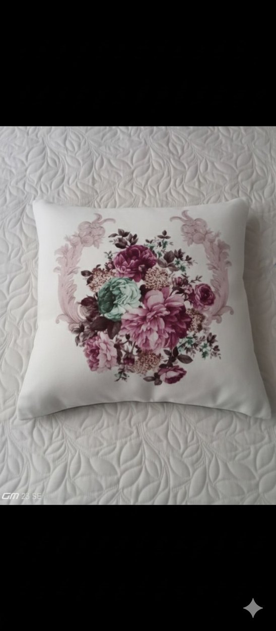 Pastel renklerde çiçek desenli, modern klasik tarzda beyaz zeminli kırlent kılıfı. 40*40 ebatlarında