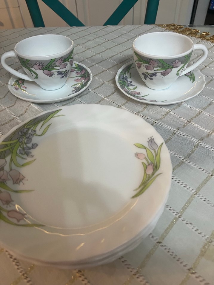 Pastel çiçek desenli parlex kahve fincanları, uyumlu tabaklar ve küçük tabaklarla birlikte sunuluyor. Beyaz zemin üzerinde zarif çiçek motifleri yer alıyor. ☕