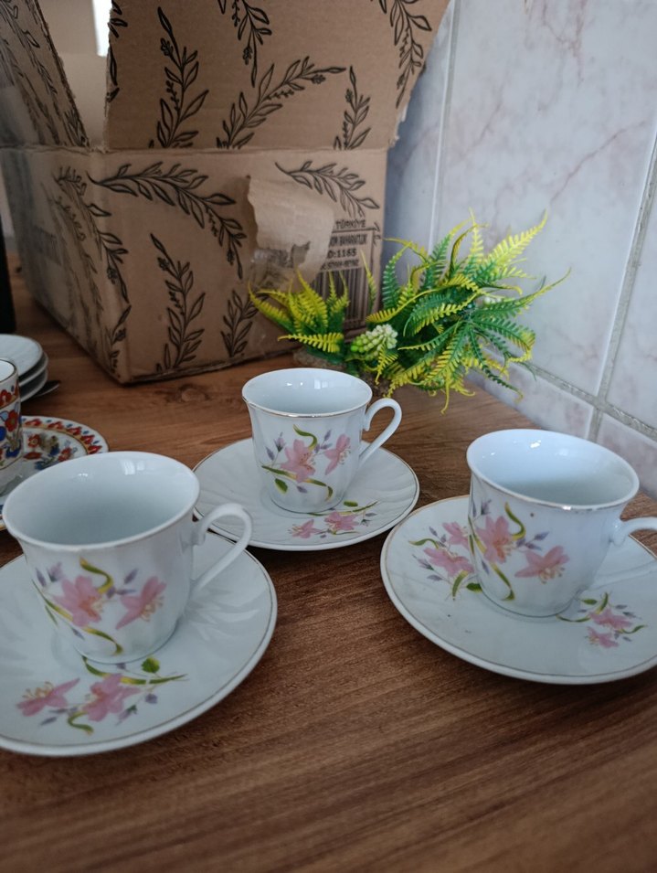 Pastel çiçek desenli beyaz porselen fincanlar, her biri uyumlu bir tabakla birlikte. Çay veya kahve sunumu için uygundur. ☕