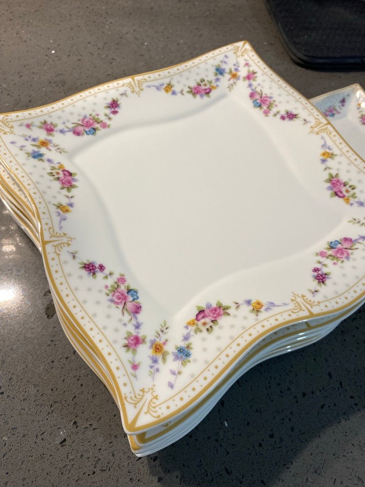 Pastel çiçek desenleri ve altın detaylı, beyaz porselen 6 kişilik kahvaltı takımı. Hafif kavisli kenarları vardır.