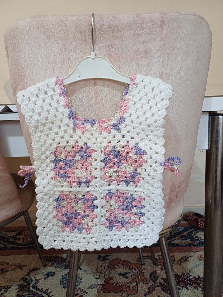 Bu bebek önlüğü, pastel çok renkli bağlamalı bağlamalı el işi örgü desene sahiptir. Rahat ve şık kullanımı sağlar.