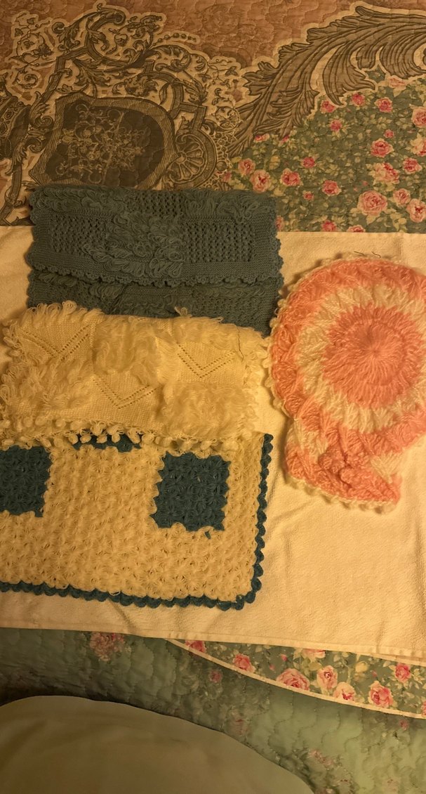 Çeşitli örme ve tığ işi desenlere sahip pastel tonlarda çok renkli banyo süngerleri.