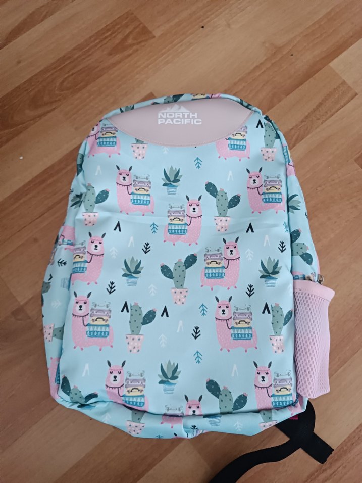 Pastel çok renkli çocuk sırt çantası, eğlenceli lama ve kaktüs desenine sahip, yan file cepli, hafif ve kullanışlıdır.