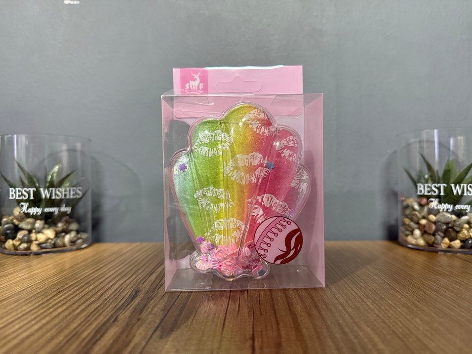 Pastel çok renkli, deniz kabuğu şeklinde parlak ruj. Üzerinde dudak baskıları bulunur ve dudaklara yumuşak renkli parlaklık verir.