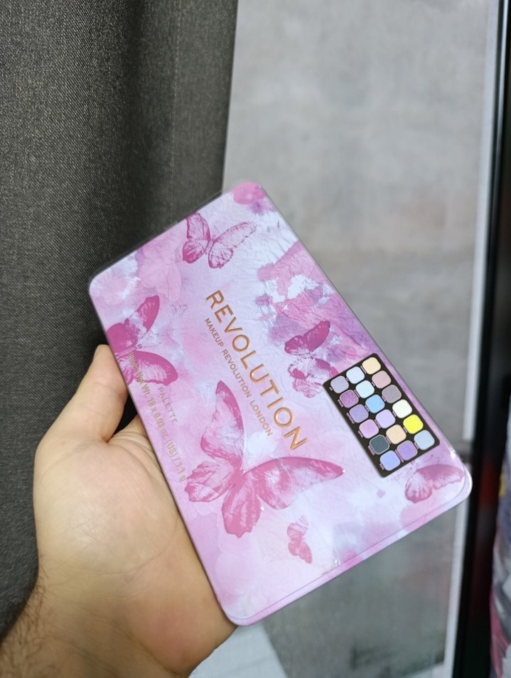 Revolution markasına ait pastel tonlarda çok renkli göz farı paleti, kelebek desenli kompakt metal kutuda sunulmuştur.