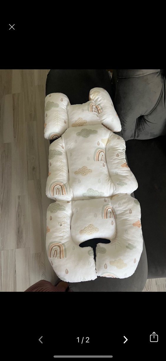 Bulut ve gökkuşağı desenleriyle pastel çok renkli, konforlu ve destekleyici puset minderi.