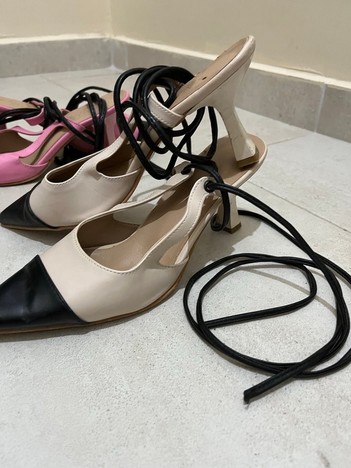 Elastik detaylı, pastel çok renkli yılan desenli, esnek kauçuk malzemeden yapılmış stiletto topuklu kadın ayakkabısı. Günlük kullanıma uygun çağdaş ve avangart tarzda. Bilekten bağlamalıdır