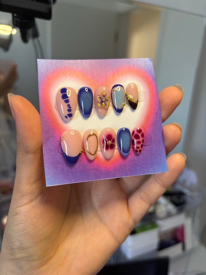 Çiçek ve geometrik desenli, altın detaylı pastel çok renkli tırnak süslemeleri seti.