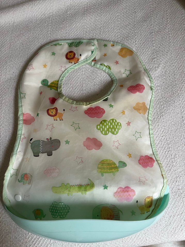 Pastel yeşil kenarlıklı, hayvan ve bulut desenli baskılı bebek önlüğü. Altında yakalama cebi ve çıtçıt kapama bulunur.