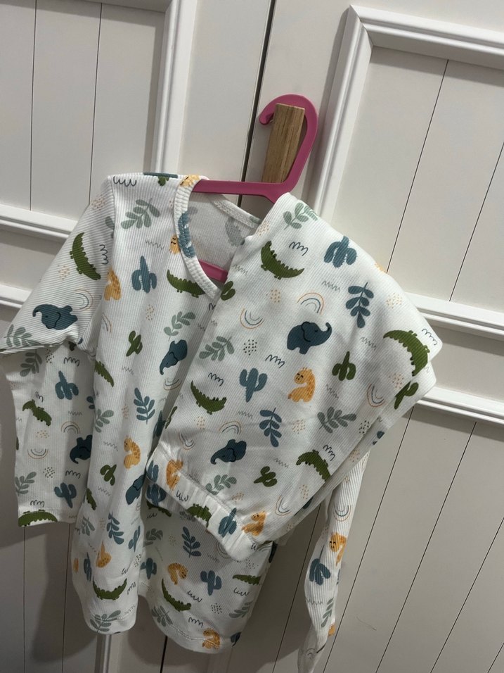 Pastel renklerde dinozor ve bitki desenleri bulunan beyaz çocuk pijama takımı, yumuşak ve rahat kumaştan üretilmiştir.