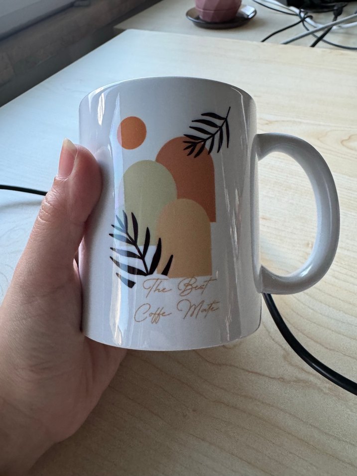 Pastel soyut şekiller ve siyah yaprak desenleriyle beyaz kahve kupası, üzerinde 'The Best Coffee Mate' yazısı bulunuyor. ☕