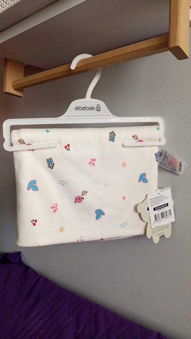 Yumuşak kumaştan yapılmış, pastel renklerde küçük kuş ve çiçek desenleri bulunan beyaz bebek önlüğü. Üzerinde 'ebebek' markası etiketi var.