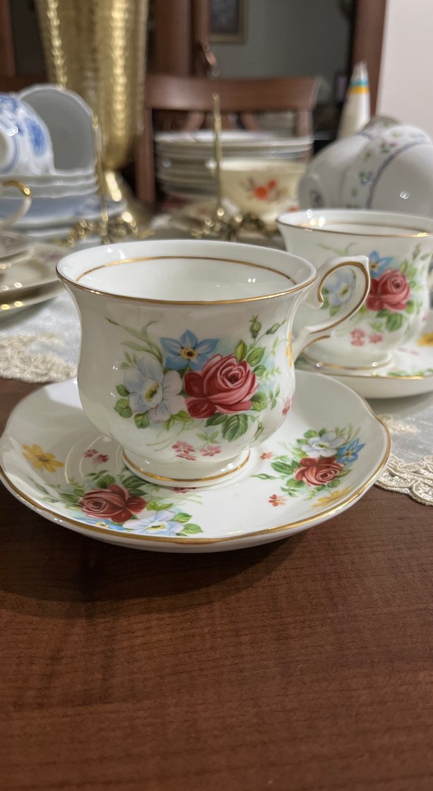 Pastel renklerde çiçek desenleri ve altın yaldızlı kenarları olan beyaz porselen fincan ve tabağı.
