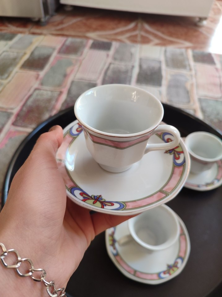 Beyaz porselen fincan takımı, kenarında pastel renkli desenlerle zarif bir görünüm sunar. Kahve veya çay servisi için uygundur. bir tanesi eksik beş adettir☕️