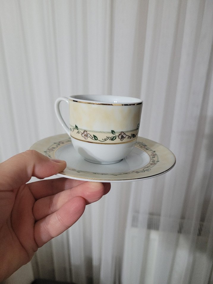 Pastel renkli çiçek desenli, altın kenarlıklı beyaz porselen fincan ve tabağı, çay veya kahve servisi için uygundur. ☕
