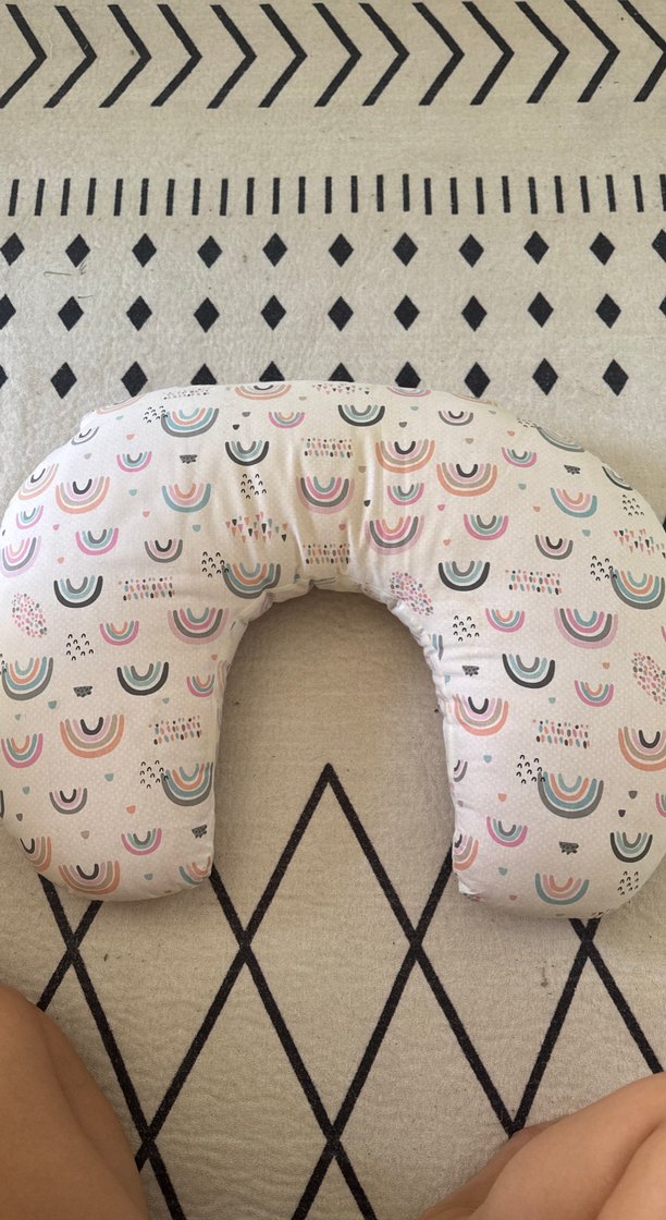Pastel çok renkli desenli, hamilelik ve emzirme için destek sağlayan yastık. Çift kılıf vardır.