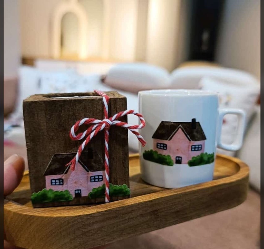 Pastel pembe ev ve yeşil detaylı beyaz seramik kupa. Kırmızı beyaz iplikle bağlanmış uyumlu dekoratif etiketiyle birlikte. ☕