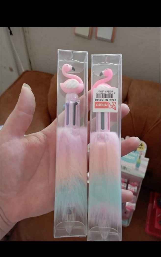 Pastel tonlarda tükenmez kalem, flamingo figürlü üst kısmı ve yumuşak tüy detaylı gövdesiyle çok renkli mürekkepler içerir. ️