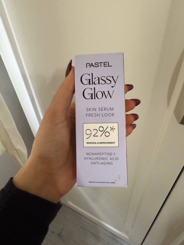 Pastel Glassy Glow dudak parlatıcısı, 92% yenileyici içerik ve hyaluronik asit ile bej tonunda anti-aging etkili cilt serumu sunar.