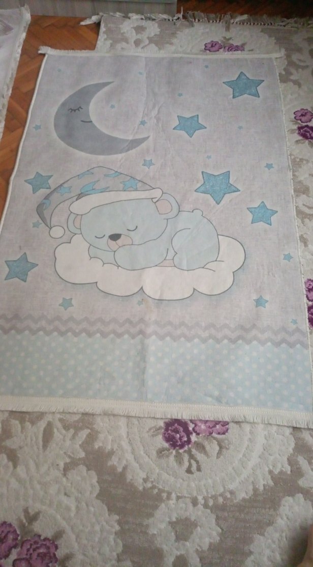 Yumuşak ve sıcak kumaştan yapılmış, pastel renklerde ay ve yıldızlar altında uyuyan ayıcık baskılı çocuk battaniyesi.boy150 en100