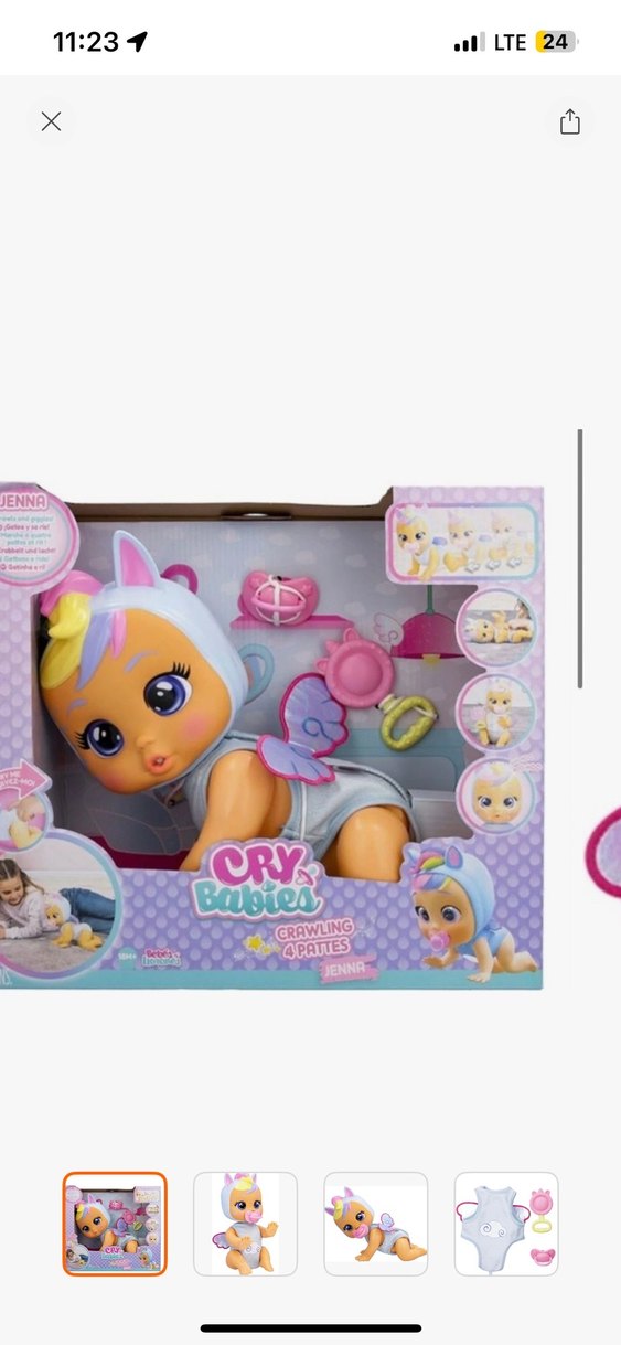 Pastel gri renkte, emekleyen pozisyonda Cry Babies bebek. Emzik ve biberon gibi aksesuarlarla birlikte gelir. Yumuşak dokulu ve sevimli tasarımlı. Çok az kullanıldı. Çocuğum sevmedi. Çalışır durumda. Hiçbir problemi yok. Emekleyen cry baby