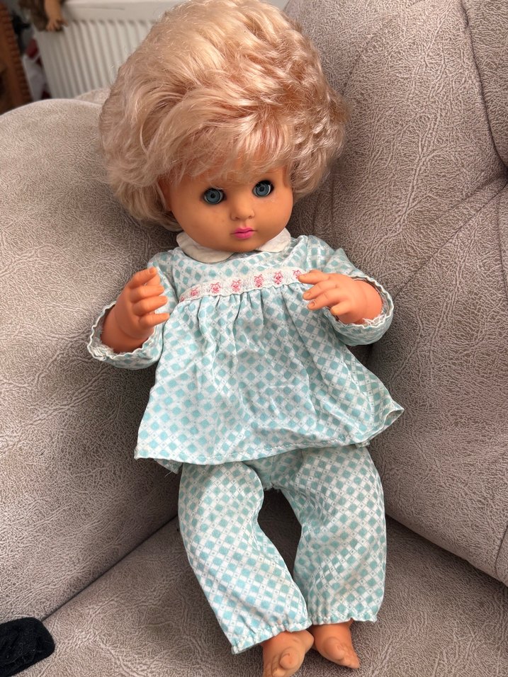 Bu bebek pastel gri desenli kıyafetler giymekte, sarı saçlı ve mavi gözlüdür. Uzun kollu üst ve uyumlu pantolonlu, yumuşak kumaştan yapılmıştır.