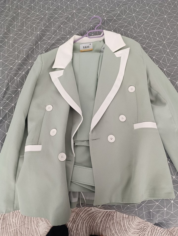 Pastel gri renkli, düğmeli, normal boyda kadın blazer. Notch yaka ve regular kesime sahip, sentetik kumaştan üretilmiştir, ofis için uygundur.