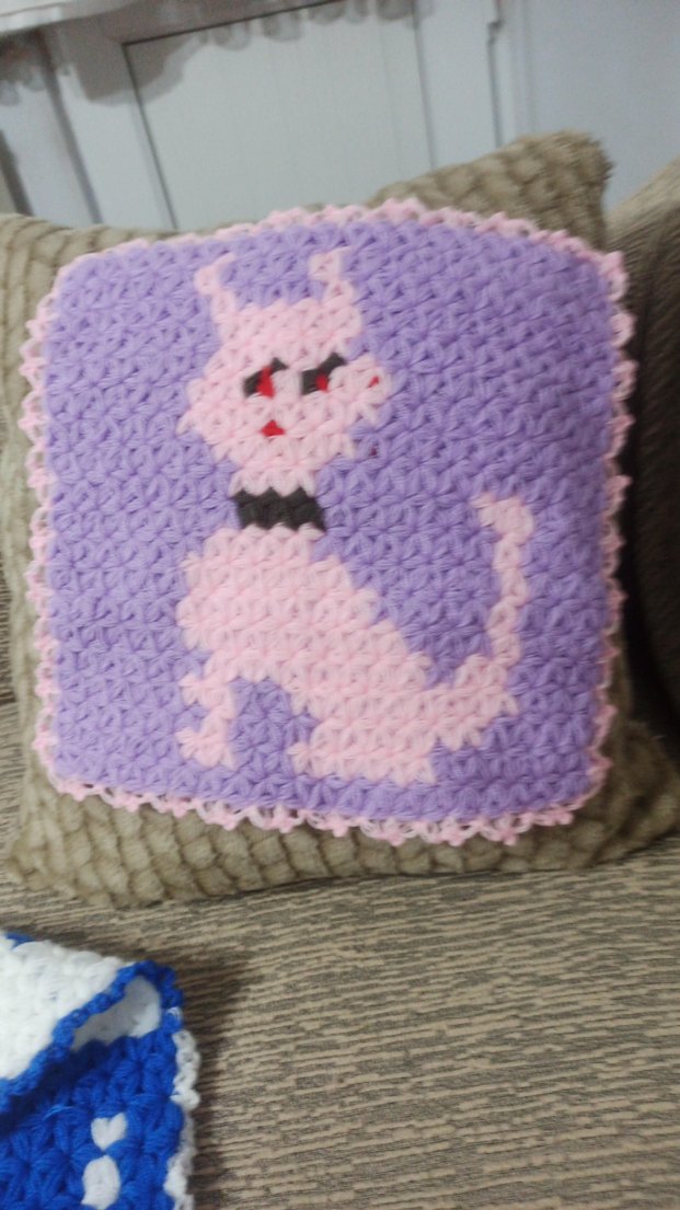 Pastel gri renkte, yumuşak iplikle örülmüş kedi figürlü dekoratif