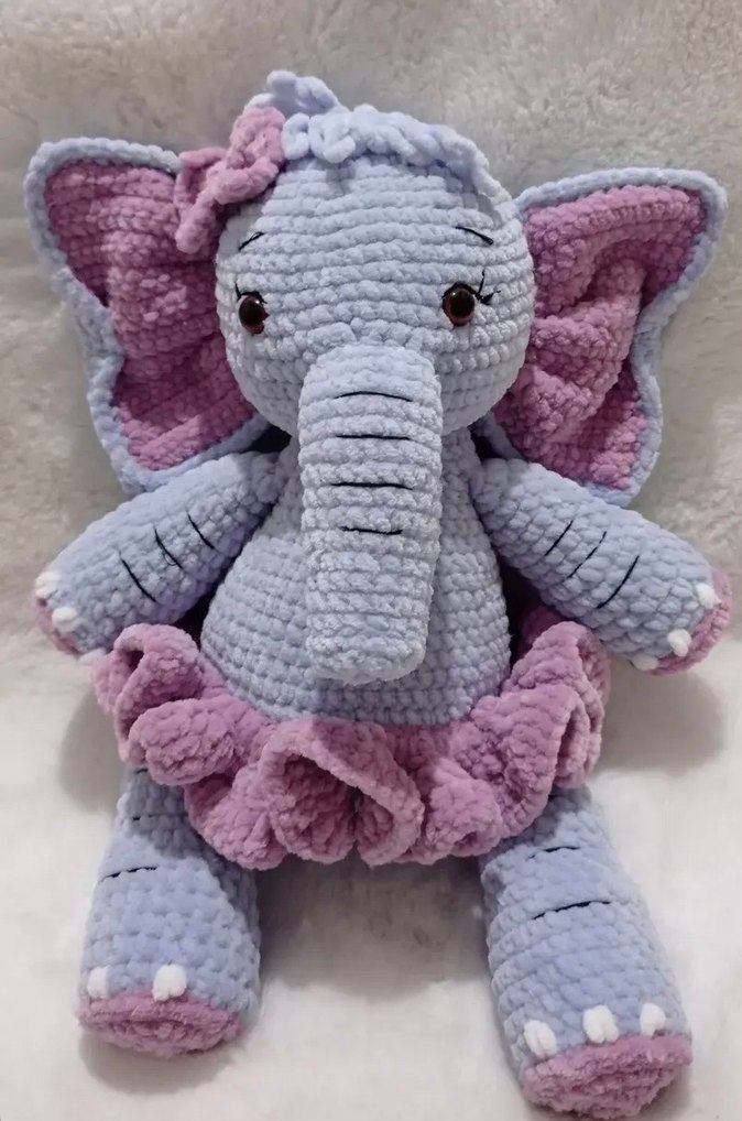 El emeği istenilen renkte yapılır kadife ip ile yapılmış pastel gri peluş fil oyuncak, pembe tütü eteği ve büyük kulakları ile dikkat çekiyor.