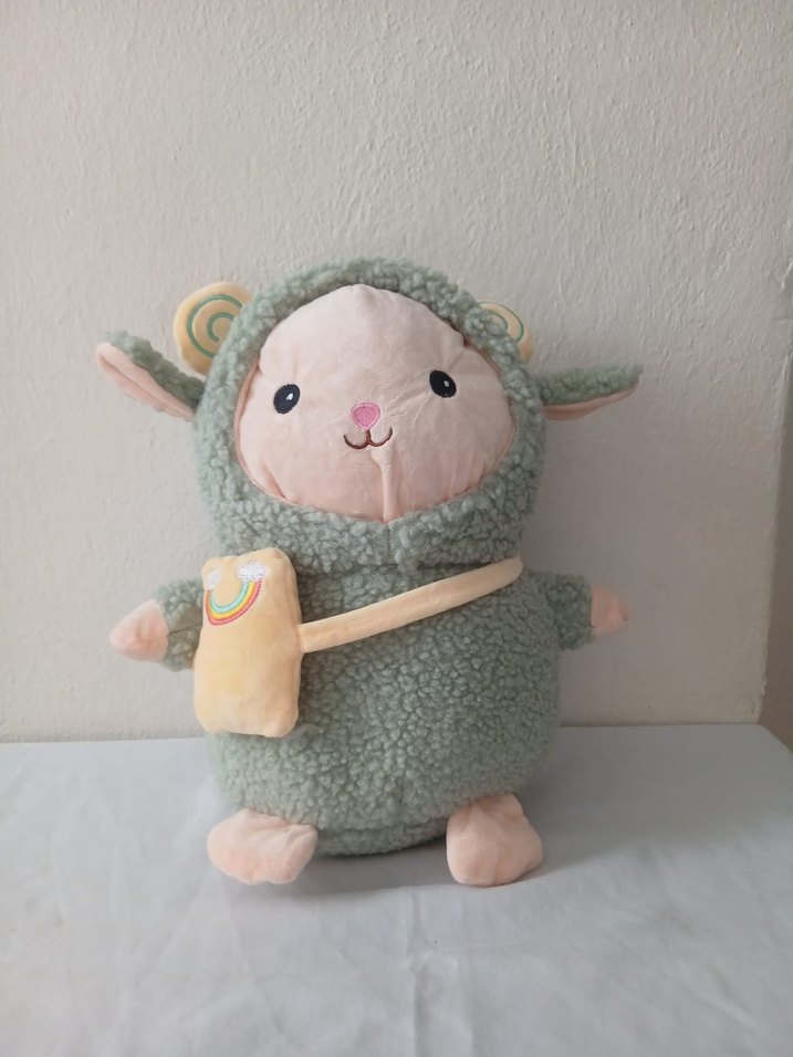Pastel gri renkli, yumuşak dokulu peluş koyun oyuncak. Üzerinde gökkuşağı desenli küçük pastel sarı çanta bulunur.