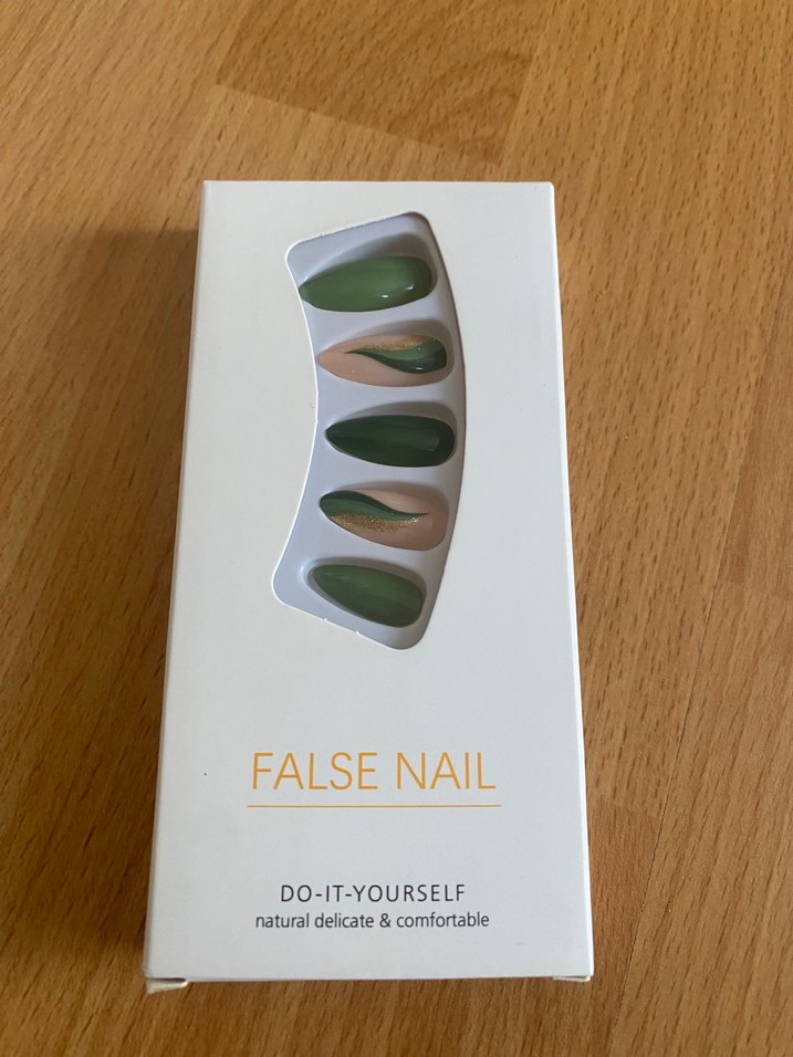Pastel haki renkte, doğal, hassas ve rahat sahte tırnak seti. Kendin yap tırnak süsleme seti.