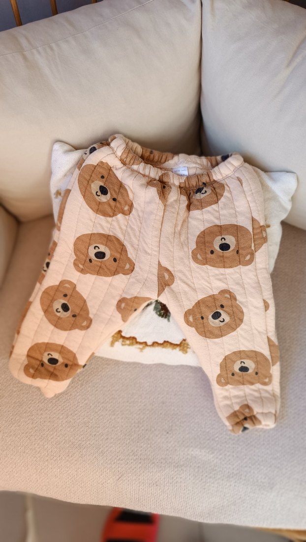 Pastel kahverengi ayı yüzü desenli, yumuşak ve sıcak bebek pantolonu. Uyku sırasında rahatlık sağlar.