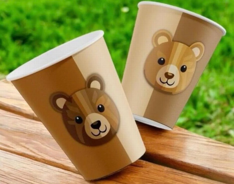 Pastel kahverengi ayı yüzü desenli kağıt bardaklar, günlük kullanım için uygun. Doğum günü konsepti