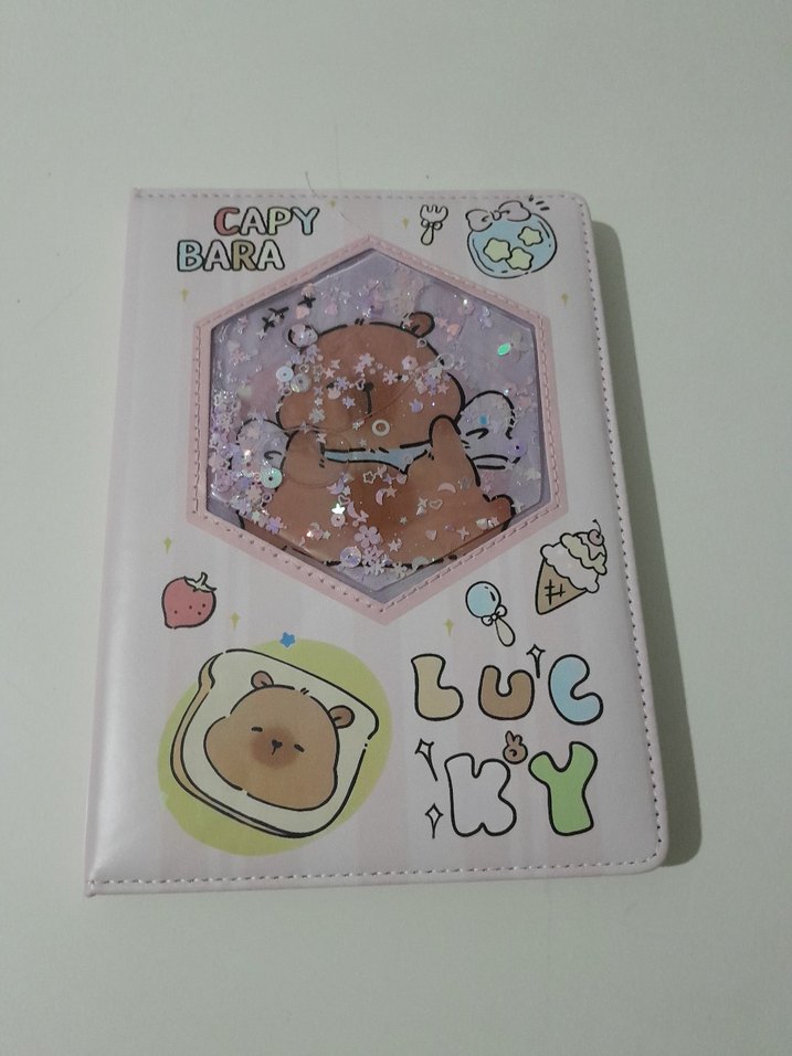 Pastel kahverengi kapaklı, simli ve sevimli ayıcık desenli defter. Üzerinde 'CAPY BARA' ve 'LUCKY' yazıları ile çeşitli çizimler bulunur.