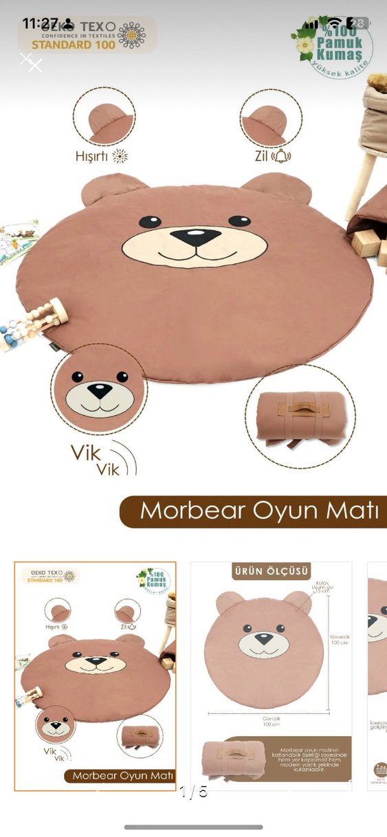 Pastel kahverengi, yumuşak ve sıcak kumaştan yapılmış ayıcık desenli oyun matı. Zil ve hışırtı sesiyle duyusal oyun sağlar. Çocuklar için uygundur.