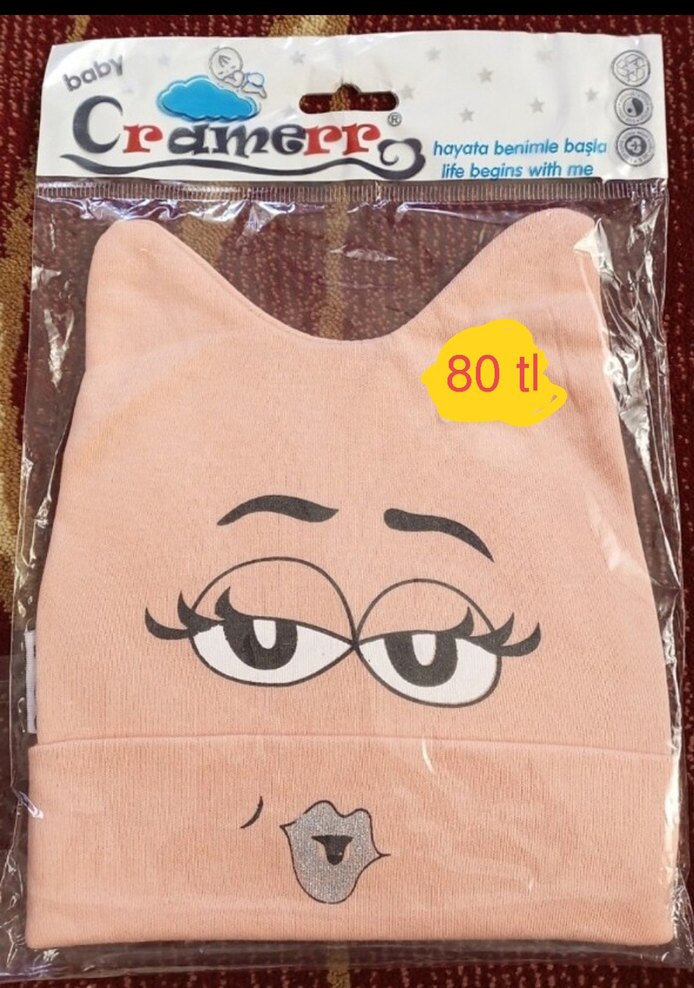 Pastel kahverengi, eğlenceli baskılı yüz deseni olan yumuşak ve rahat bebek önlüğü. Fiyatı 80 TL. 0-3 ay 15 cm.