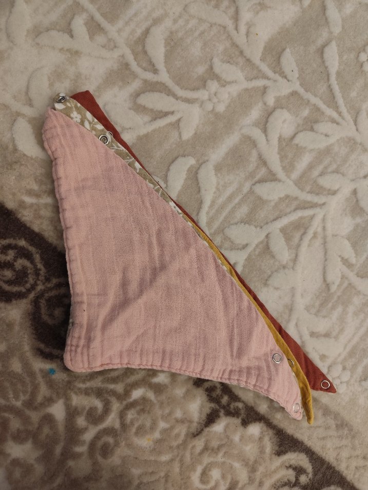 Pastel kahverengi batik desenli, çıtçıtlı bebek önlüğü, beslenme sırasında rahat kullanım sağlar.