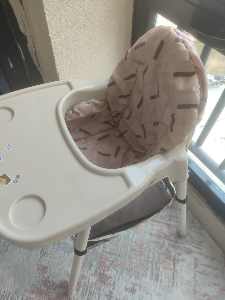 Pastel kahverengi mama sandalyesi, yumuşak dolgulu oturma alanı ve çıkarılabilir tepsi ile birlikte gelir. Altında saklama sepeti bulunur.