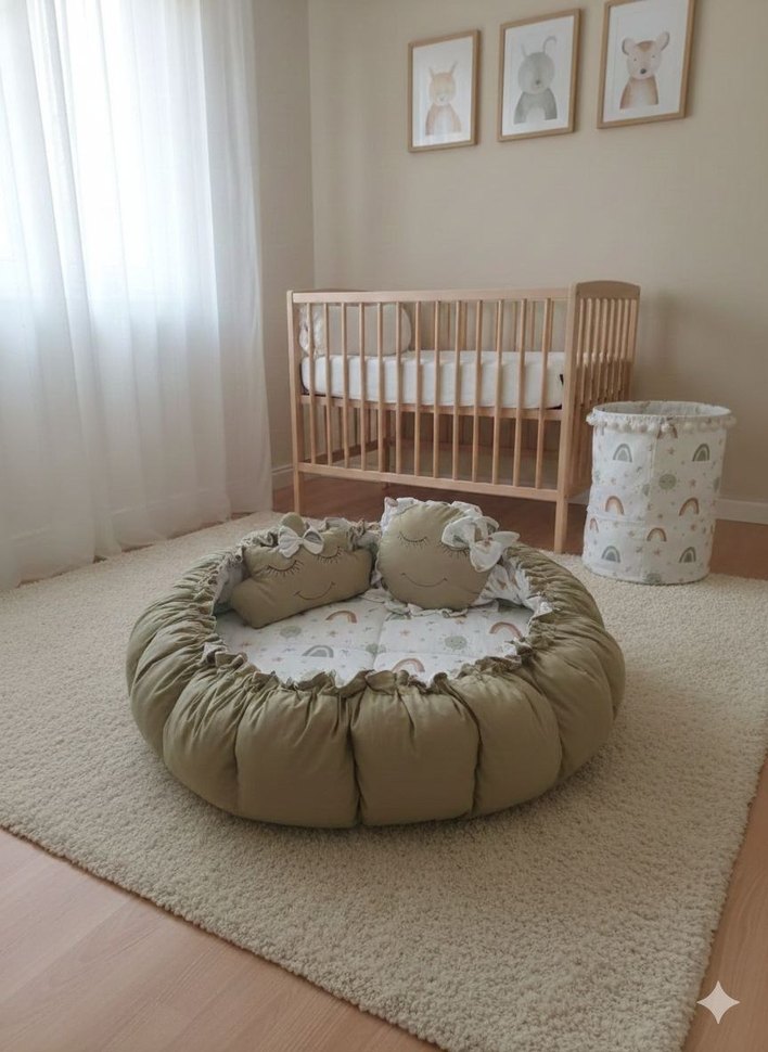 sipariş alıyorum dikimini kendim yapıyorum istenilen renkte sipariş alıyorum açık olarak çapı 1.50 cm kapandığında 85 cm çapındadır yıkanabilir şiltesi vardır 2 adet dekoratif yastık ile birlikte 4 parça set olarak gönderilecektir Pastel yeşil, yumuşak dolgulu kenarları ve uyuyan yüz ifadeli, fiyonk detaylı iki yastığı olan bebek oyun yatağı. İç kısmında gökkuşağı ve güneş desenleri bulunur. #kadın #bebek #oyunminderi #baybynest #hediye #hediyelik #dikiş #elemeği #elyapımı