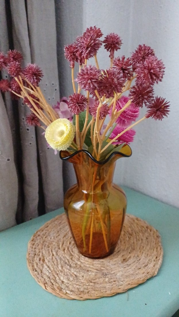 Pastel kahverengi camdan yapılmış, kıvrımlı kenarlı ve şeffaf bir gövdeye sahip vazo, kuru veya taze çiçekler için uygundur. cicekler dahil degildir 16 cm dir