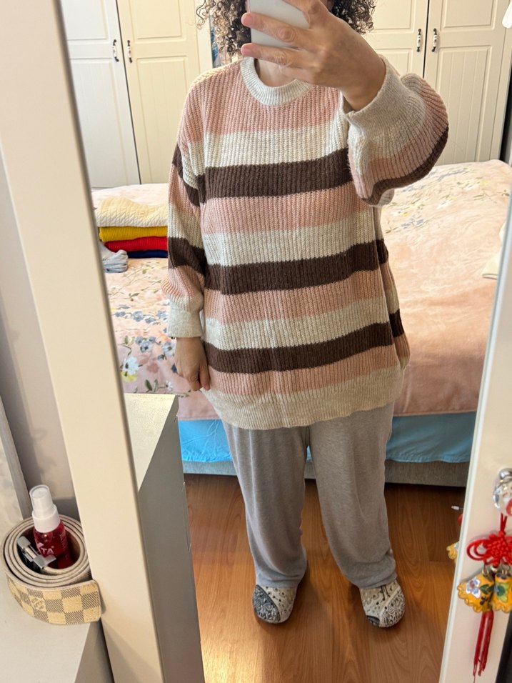 Pastel kahverengi çizgili triko, uzun kollu ve yuvarlak yaka, bol kesim kadın kazak. Rahat ve günlük kullanıma uygun.