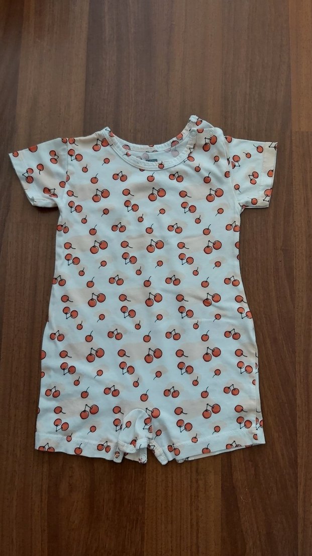Pastel kahverengi renkli, kiraz desenli ve düğmeli bebek kız tulumu. Yumuşak ve rahat bir yapıya sahiptir.