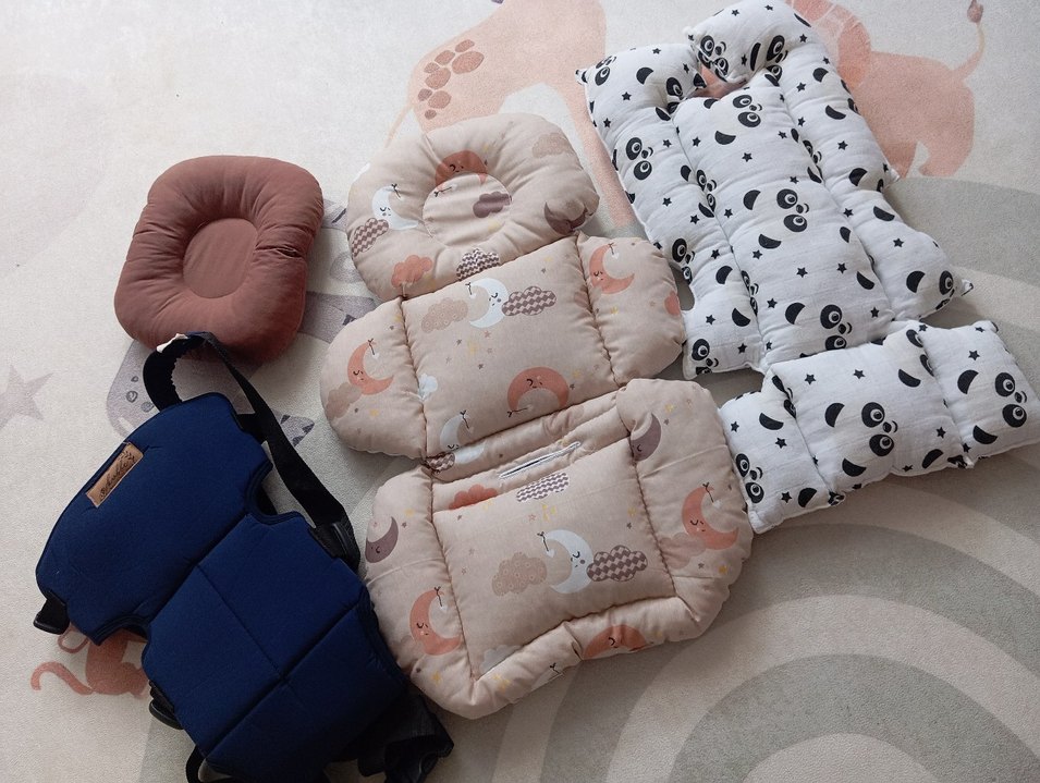 iki adet puset ve Bebek Arabası minderi bir adet lacivert bebek kanguru yastık